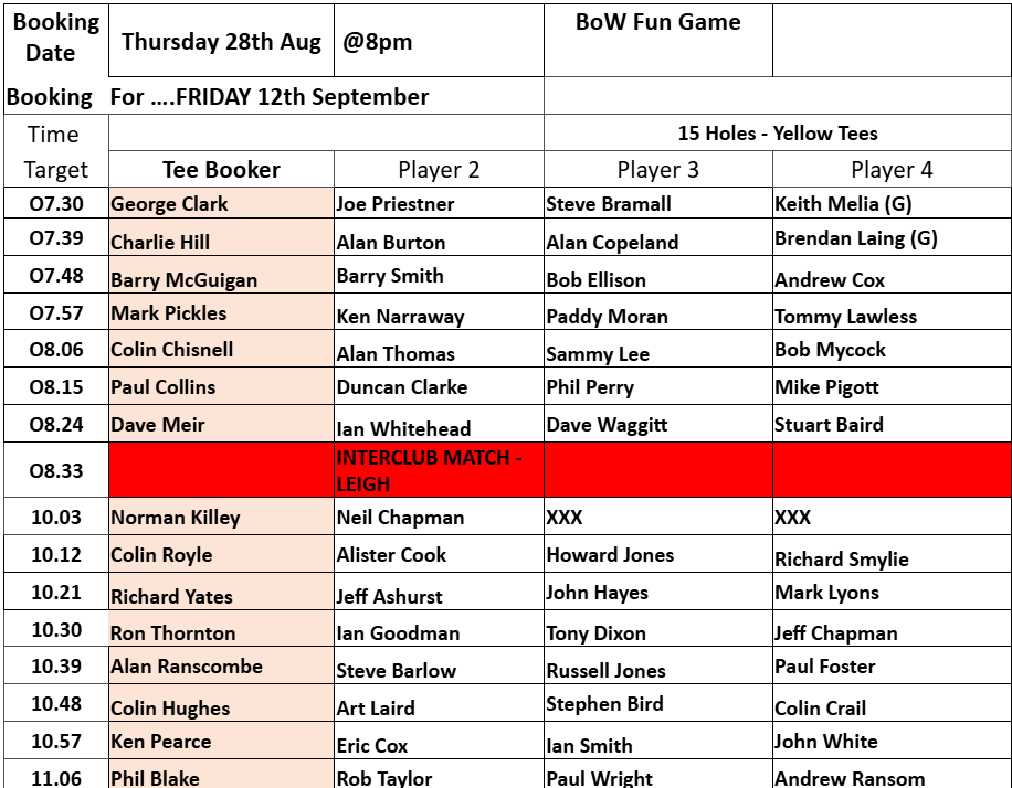 Tee-booking schedule for tomorrow (Thursday 27 August)
