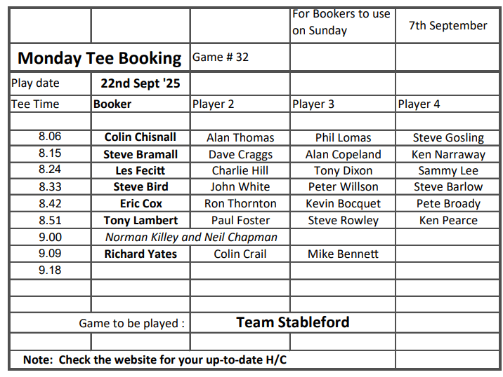 Happy Mondays tee-booking schedule for Sunday 7 September