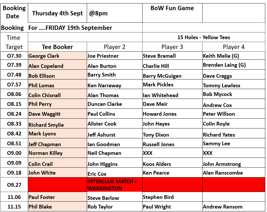Tee-booking schedule for tomorrow (Thursday 4 September)