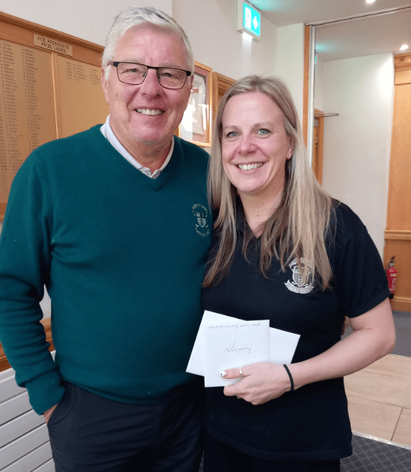 Lindsay Fox left Lymm Golf Club today, after 24 years of service, heading for pastures new. I’m sure that I can speak for all of us in the Senior Section in saying that we will miss Lindsay. The seniors’ committee agreed to present Lindsay with a £50 M&S Voucher. Of the few of us in the clubhouse at lunchtime today, Arthur Nuttall, who served for 7 years on the seniors’ committee, was ‘volunteered’ to present the voucher and a card signed by many of us to Lindsay.