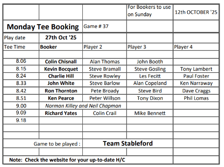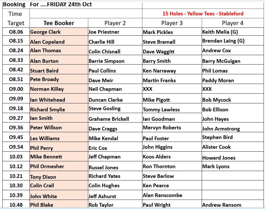 Tee-booking schedule for tomorrow (Thursday 9 October)