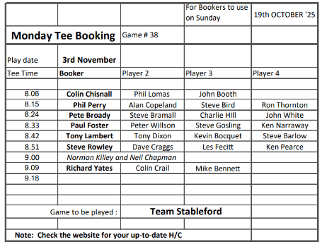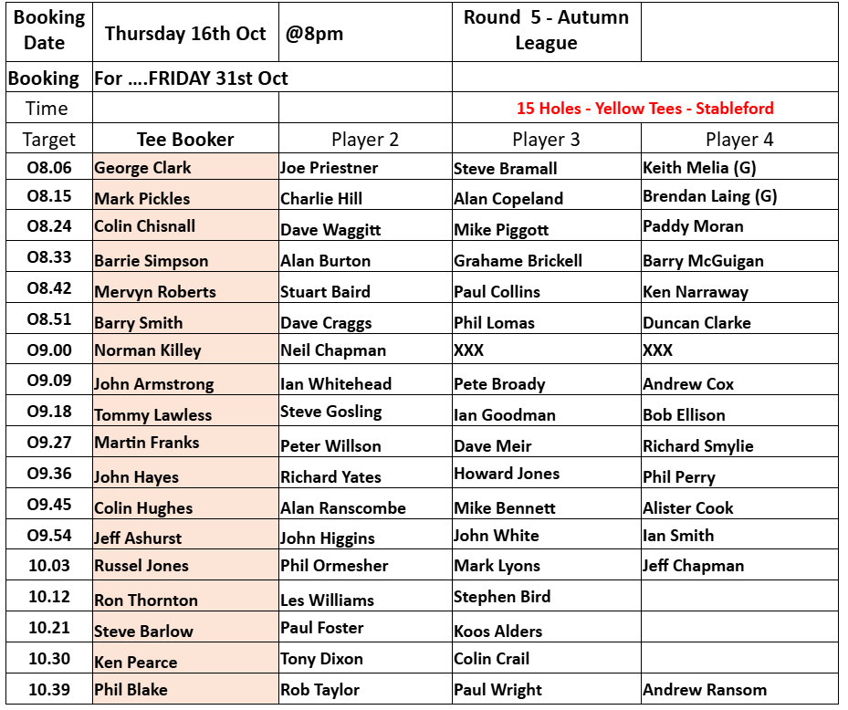 Tee-booking schedule for tomorrow (Thursday 16 October)