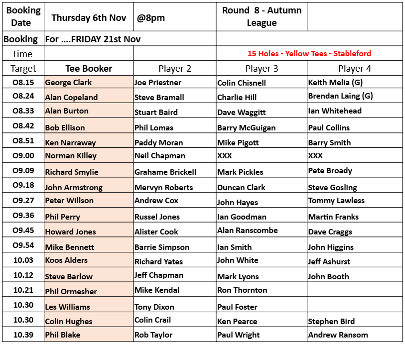 Tee booking schedule for tomorrow (Thursday 6 November)