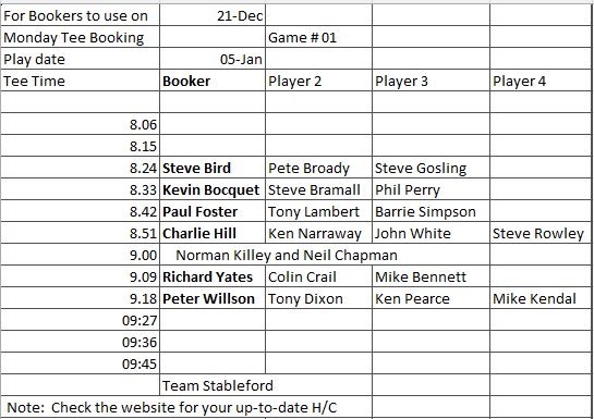 Tee booking schedule for tomorrow Thursday 18 December