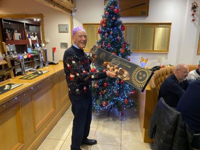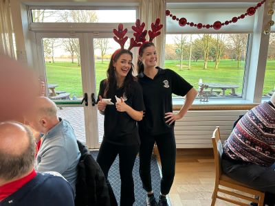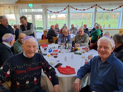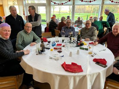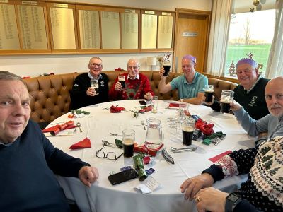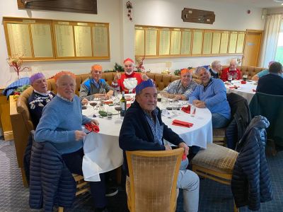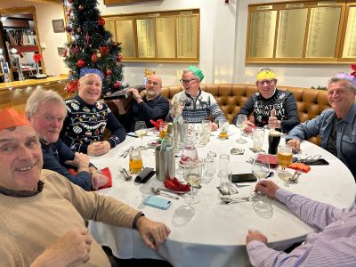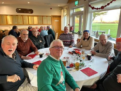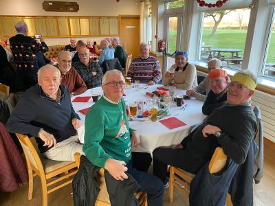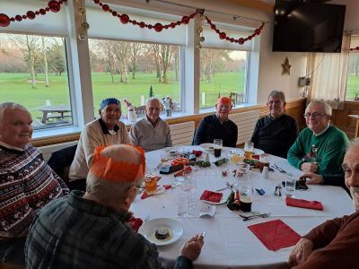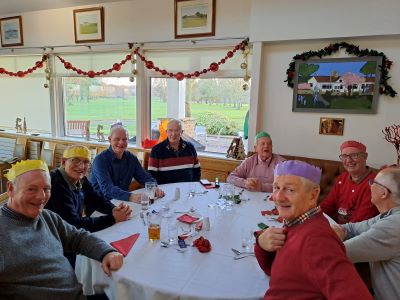 No golf before our Christmas do! The course was closed for the day to avoid the possibility of contracting trench foot on a waterlogged track. As we didn’t have to chop our way through the mud all our energy could be diverted to carousing in the clubhouse. Top marks to Paul Foster for keeping his party hat on well into the evening. I’m sure that everyone who attended will agree that it was a first-class event. Great food, wonderful companionship and a chance to get to know each other better. It’s far easier to communicate with your fellow seniors when you’re sat next to each other, rather than having to shout across an unused fairway from your side of the rough. I’ve put a few photographs of some of the more photogenic attendees below.