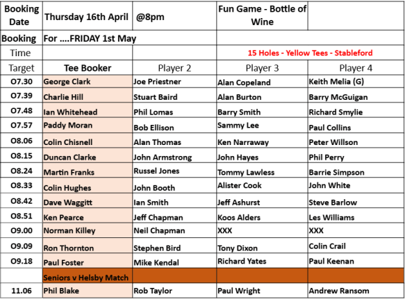 Please note that as we are playing a seniors’ match against Helsby GC on the 1st of May the preferred playing times requested by seniors may not be available